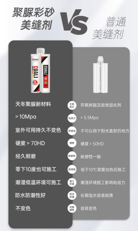 與環(huán)氧美縫相比,純聚脲美縫的粘結(jié)力更強(qiáng)。固化后堅(jiān)硬無比、耐磨性強(qiáng),防刮抗壓耐沖擊,不開裂脫落,使用壽命更長久。